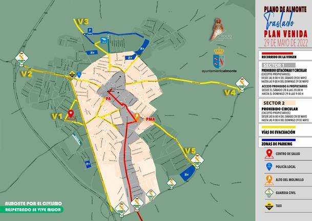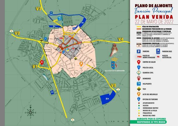 Para las restricciones de circulación y estacionamiento, el Ayuntamiento de Almonte ha diseñado dos sectores en el municipio, siendo el número 1 el más cercano al recorrido de la Virgen, y el 2 el aledaño a las calles del propio recorrido.