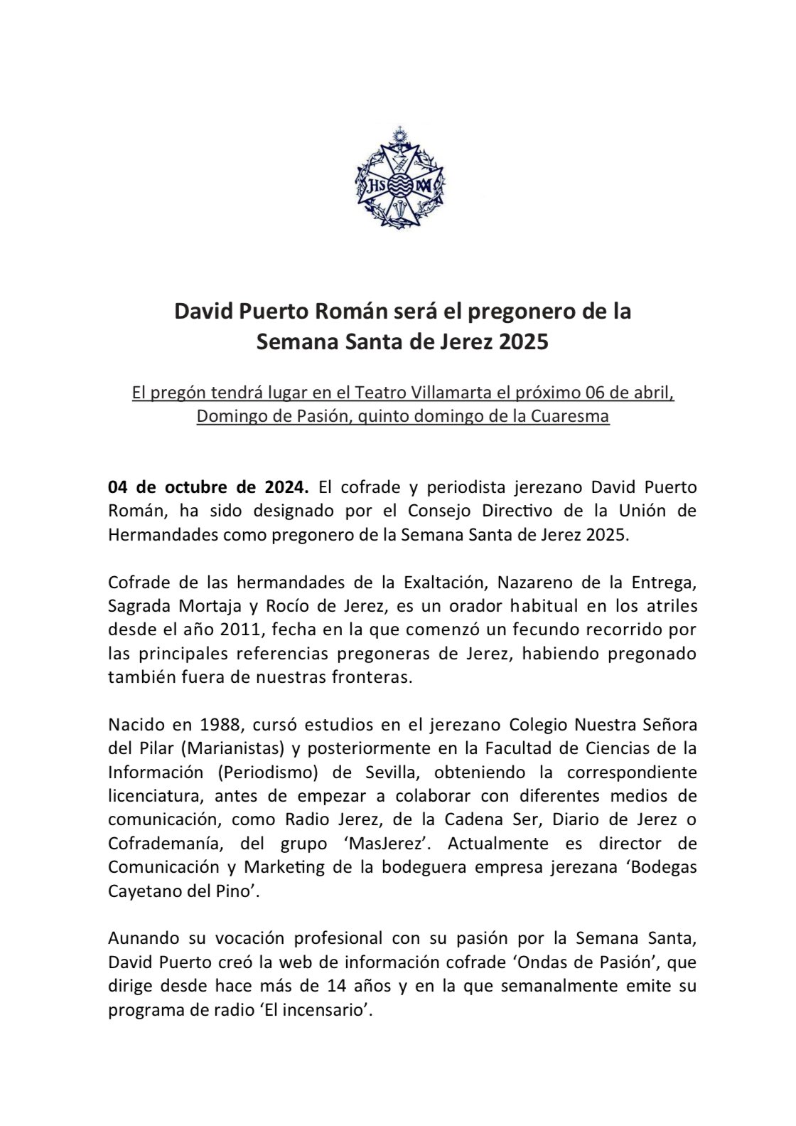 El cofrade jerezano David Puerto Román ha sido designado como el pregonero de la Semana Santa de Jerez 2025. El Consejo Directivo de la Unión de Hermandades de Jerez ha confirmado que su esperado pregón se llevará a cabo el próximo 6 de abril, coincidiendo con el quinto domingo de Cuaresma, en el emblemático Teatro Villamarta.