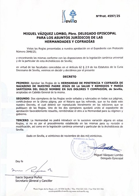 SEVILLA | La Archidiócesis de Sevilla ha ratificado oficialmente la actualización de las Reglas de la Hermandad de Bellavista. El decreto episcopal, firmado recientemente, dota a la corporación de un marco legal moderno y adaptado a la realidad de sus cultos externos actuales.