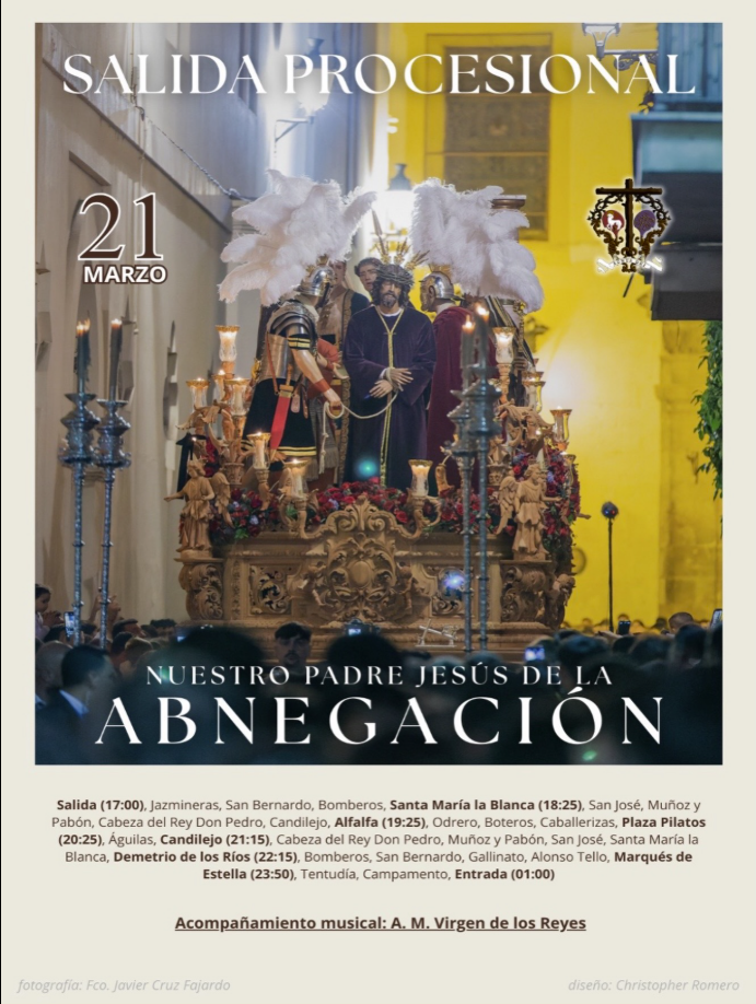 El cartel que anuncia esta salida procesional corresponde a la imagen ganadora del Concurso Fotográfico 2025, una obra firmada por D. Francisco Javier Cruz Fajardo. La instantánea refleja con sobriedad y profundidad el caminar del Señor, captando la esencia espiritual de Nuestro Padre Jesús de la Abnegación en plena estación penitencial.