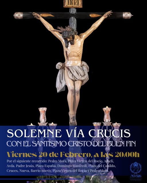 La Hermandad de Santiago Apóstol de Aznalcázar celebrará el próximo viernes 20 de febrero, primer viernes de Cuaresma, el solemne Vía Crucis con la imagen del Santísimo Cristo del Buen Fin, un acto de profunda significación espiritual enmarcado dentro del Año Extraordinario “Angustias Porta Coeli”, con motivo del 450 aniversario fundacional de la corporación.