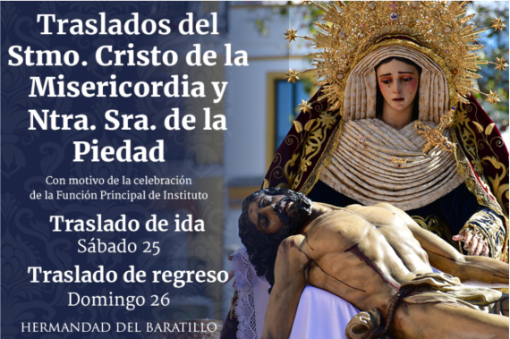 Tras finalizar la Santa Misa del último día del Solemne Quinario en honor al Stmo. Cristo de la Misericordia y Ntra. Sra. de la Piedad del próximo sábado 25 de febrero, tendrá lugar el traslado en andas de nuestros Sagrados Titulares a la Iglesia del Señor San Jorge del Hospital de la Santa Caridad para celebrar la Función Principal de Instituto al día siguiente, domingo día 26. El itinerario de ida será el siguiente estando prevista la salida a las 20:30 horas: Adriano, Otto Moeckel, Gracia Fernández Palacios, Antonia Díaz, Techada, Pavía, Dos de Mayo y Temprado para llegar al Hospital a las 21:35 horas.