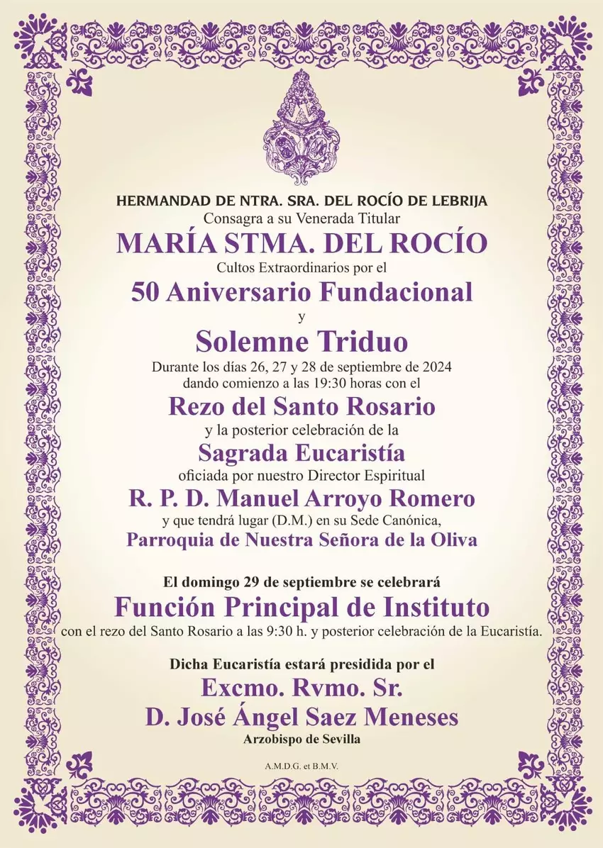 El punto culminante de los cultos será la Función Principal de Instituto, programada para el domingo 29 de septiembre. Este evento, que comenzará a las 09:30 horas con el rezo del Rosario, será oficiado por el arzobispo de Sevilla, José Ángel Sáez Meneses, en lo que se anticipa como una ceremonia solemne y llena de significado. La participación del arzobispo de Sevilla resalta la importancia de esta celebración no solo para la hermandad, sino para toda la comunidad religiosa de Lebrija.