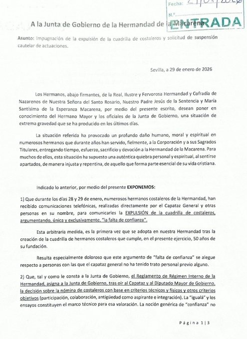 Entre los costaleros excluidos figuran hermanos con décadas de servicio bajo el paso, lo que ha incrementado el malestar interno. En el documento dirigido a la Junta de Gobierno, solicitan una reunión urgente con el Hermano Mayor, así como acceso al acta del Cabildo de Oficiales en el que supuestamente se habría aprobado la decisión.