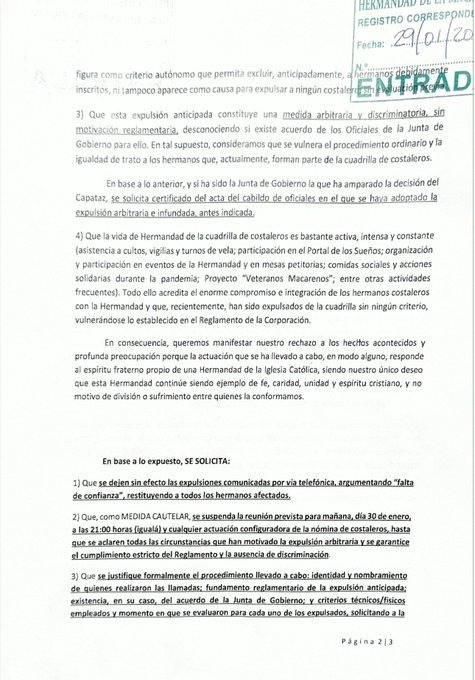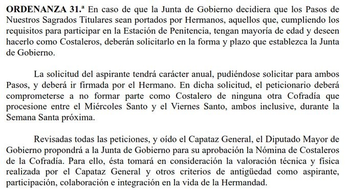 Los costaleros apartados fundamentan su reclamación en la Ordenanza 31ª del Reglamento Interno de la Hermandad, que establece que la nómina de costaleros debe ser aprobada por la Junta de Gobierno tras la valoración del Capataz General, atendiendo a criterios como antigüedad, participación e implicación en la vida de Hermandad, además de exigir una comunicación oficial y por escrito, que aseguran no haber recibido.