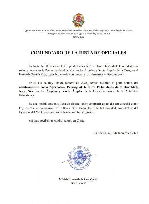 La autoridad eclesiástica ha nombrado a la primera agrupación parroquial de Sevilla Este, la del Señor de la Humildad, conocida popularmente como ‘La Espiga’. Es el paso previo a que esta zona de la ciudad cuenta con una hermandad de penitencia.