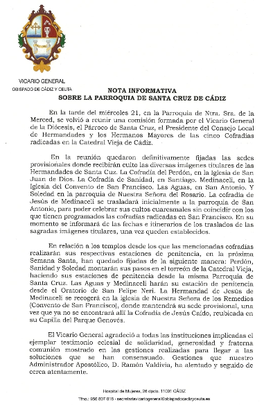 La diócesis de Cádiz y Ceuta ha confirmado oficialmente la reubicación provisional de las hermandades con sede canónica en la parroquia de Santa Cruz, como consecuencia del cierre del templo para acometer su esperada reforma integral. La medida afectará directamente al desarrollo de la Semana Santa de Cádiz 2026, tanto en lo relativo a los cultos cuaresmales como a las estaciones de penitencia.