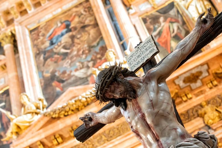 Se trata de una escultura en madera de cedro real dentro de los cánones clásicos barrocos del siglo XVII, representando a Cristo muerto en la Cruz sujeto con tres clavos. De estudio anatómico completo y con algunos detalles muy personales que acompañan a esta Obra clásica; tales como sudario tratado dentro del estilo más personal del artista. Se refleja, además, un exhaustivo tratamiento de las telas y un anudado más novedoso mediante juego de borlas. Estamos ante una obra de una belleza, dulzura y espiritualidad contrapuesta a la tensión propia y traumática de una muerte en la Cruz, que presenta una inclinación en el torso de 42º sobre el estípite, posición que hace posible que la Imagen se descuelgue o incline hacia adelante con gran aplomo para estirar los brazos apoyando su peso sobre la pierna izquierda.